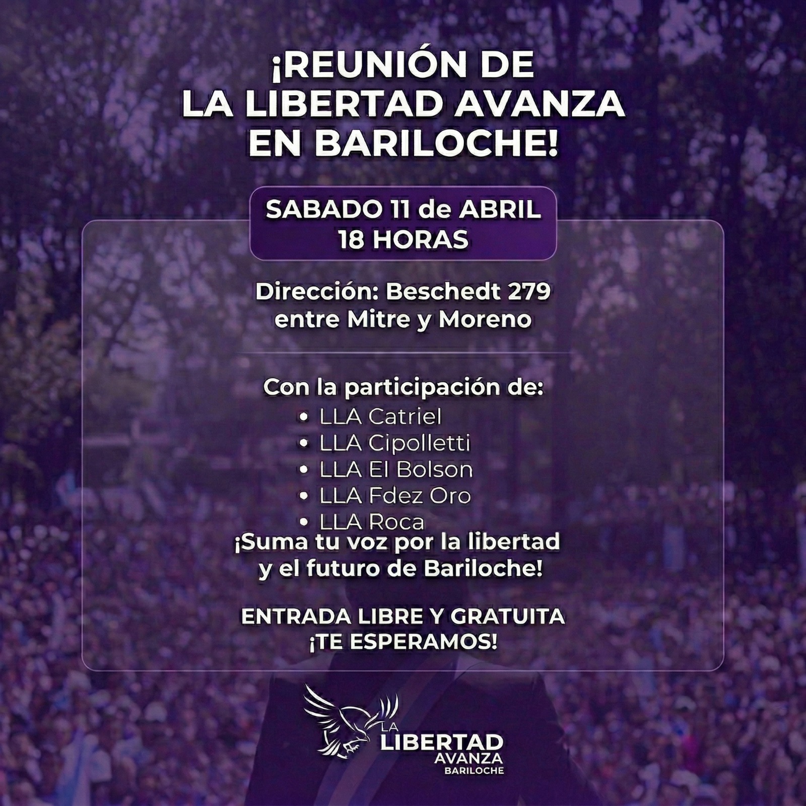 El partido La Libertad Avanza (LLA) anunció la realización de una "Gran Reunión" en San Carlos de Bariloche, programada para este sábado 11 de abril a las 18:00 horas. El encuentro tendrá lugar en el salón ubicado en Beschedt 279, entre las calles Mitre y Moreno, con el objetivo de fortalecer la presencia del espacio en la región andina y debatir propuestas para el futuro local, convocada por los referentes de la mesa local. Se realizarán afiliaciones y será un momento de intercambio de ideas entre los grupos de militancia de la provincia.